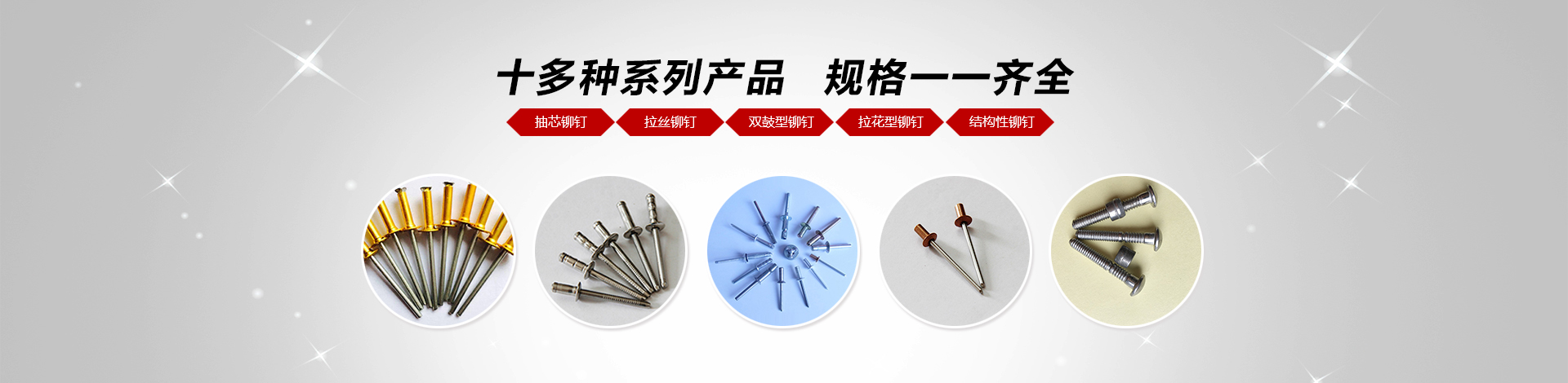我們主要產(chǎn)品有:2.4-6.4的圓頭,沉頭(平頭),開口,封閉系列抽芯鉚釘(拉釘),還有燈籠鉚釘,拉絲鉚釘,雙鼓型鉚釘,拉花型鉚釘?shù)鹊冉Y(jié)構(gòu)性鉚釘,材質(zhì)有鋁,不銹鋼,鐵,銅;還有M3-M12的平頭,沉頭,小頭系列鉚螺母,有圓桿型、帶槽型、六角型(半六角)、盲孔型等,材質(zhì)有鋁,不銹鋼,鐵,銅。